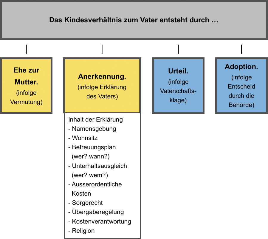 Besteht das Kindesverhältnis nur zur Mutter (nicht verheiratet), so kann der Vater oder der Konkubinatspartner das Kind vor oder nach der Geburt anerkennen. Für den Vater lohnt sich die Regelung aller anstehenden Fragen auf einmal, siehe Schema. Eine minimale Vaterschaftsanerkennung, im schlimmsten Fall organisiert durch eine Beistandschaft mit ihrem einseitigen Fokus auf Unterhalt, bedeutet zu oft den Startschuss für eine Zahlvaterschaft. Denn für die Feststellung oder gar Vollstreckung von Besuchsrechten reicht die Beistandschaft nicht mehr. Dies wird mit Rechtsverzögerung auch bei der KESB verunmöglicht oder schwer gemacht. Sehr oft geschieht im Laufe der Zeit ein Gesinnungswandel der Mutter. Sie bezieht aufgrund des staatlich geschützten Vertrags hohen Kinderunterhalt und scheut oft je länger, desto mehr den gemeinsamen Aufwand im Zusammenhang mit Erziehungsfragen, mit Informationspflichten und Entscheidungsprozessen zusammen mit dem Vater. Viele Frauen sehen das Leben ohne den Vater als einfacher an. Ist die Unterhaltsfrage geklärt, fehlt plötzlich das Interesse an der Regelung von Umgang, Sorgerecht usw. Die KESB sagt dann dazu: „Wenn sich die Eltern nicht einig sind, liegt eine latente Kindswohlgefährdung vor. Die Rechte des Vaters sind demgegenüber zweitrangig“. Und so befeuert die egoistische Supermutter, unterstützt durch oberflächliche KESB den adäquaten Kausalzusammenhang zur schleichenden Ausgrenzung des Vaters mit dem Erfolg einer Entfremdung. Die KESB weiss nicht, wie eine Vollstreckung eines Besuchsrechtes gehen soll und will sich auch gar nicht darum kümmern. Offen wird das nicht kommuniziert, aber gehandelt wird danach – und das zählt.