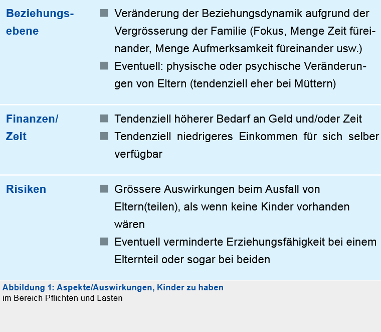 Was ändert sich eigentlich im Bereich der Pflichten und Lasten, wenn Kinder aus – respektive in – einer Partnerschaft entstehen? In diversen Teilbereichen entstehen dann diverse Auswirkungen aufgrund von dieser Veränderung auf das Leben der beiden Partner. In der folgenden Tabelle Abbildung 1 wird dies dargestellt.